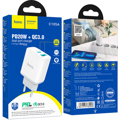 Мережевий зарядний пристрій Hoco C105A Stage з EU-штекером оснащений одним портом Type-C та одним портом USB-A для максимально ефективного заряджання ваших девайсів. Особливістю даного зарядного пристрою є LED-підсвічування кожного порту. Він сумісний з багатьма сучасними пристроями: повербанками, смартфонами, планшетами, акустичними системами різних виробників. Максимальна вихідна потужність адаптера становить 20 Вт. Є підтримка протоколів швидкої зарядки PD20W, PPS, QC3.0, QC2.0, FCP, AFC.