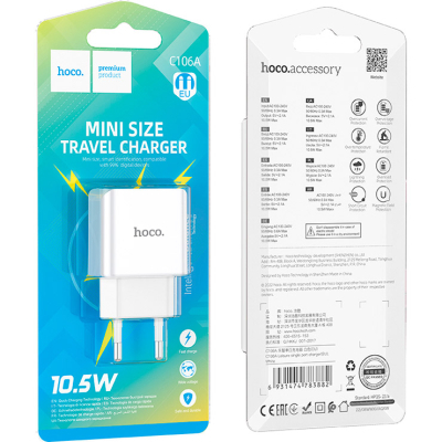 HOCO C106A Leisure single port charger set(iP) White — класичний мережевий зарядний пристрій з одним вихідним портом USB-A.