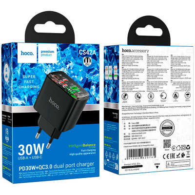 Мережевий зарядний пристрій Hoco CS42A Smart оснащений одним портом Type-C та одним портом USB-A для ефективного заряджання ваших девайсів. Він сумісний з багатьма сучасними пристроями: повербанками, смартфонами, планшетами, акустичними системами різних виробників. Максимальна вихідна потужність адаптера становить 30 Вт. Є підтримка протоколів швидкої зарядки PD30W, PPS, QC3.0, FCP, AFC.