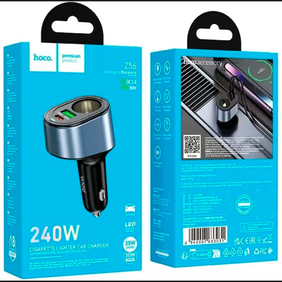 Автомобільний зарядний пристрій HOCO Z56 Friend оснащений портом USB-A потужністю 30 Вт та портом USB-C потужністю 35 Вт, що дозволяє йому здійснювати швидку зарядку з підтримкою різних протоколів, включаючи PD35W, QC3.0, FCP та AFC. Додатково пристрій має гніздо для прикурювача потужністю 12 В/120 Вт та 24 В/240 Вт. Виготовлений із вогнестійкого полікарбонату, HOCO Z56 Friend забезпечує надійність та безпеку завдяки вбудованому багаторівневому захисту. Якісні контакти встановлюють стійке з’єднання та гарантують ефективну та безпечну зарядку ваших девайсів. Дизайн пристрою доповнюється елегантним підсвічуванням, яке робить його використання зручним у темряві.