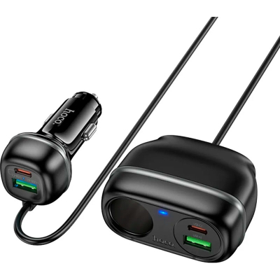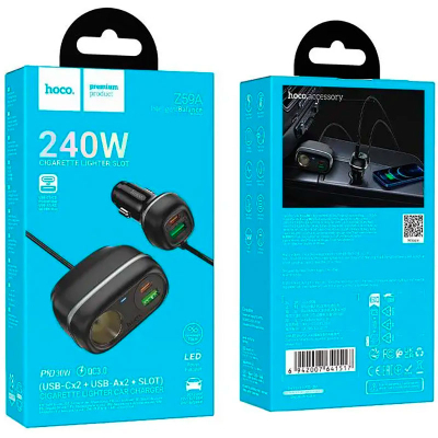 Автомобільний зарядний пристрій Hoco Z59А Rank оснащений двома портами USB-A потужністю 18 Вт кожний та двома портами USB-C потужністю 30 Вт кожний, що дозволяє йому здійснювати швидку зарядку з підтримкою різних протоколів, включаючи PD30W, QC3.0, FCP та AFC. Додатково пристрій має гніздо для прикурювача потужністю 12 В / 120 Вт та 24 В / 240 Вт. Довжина кабелю становить 0.75 м. Виготовлений із вогнестійкого полікарбонату, Hoco Z59А Rank забезпечує надійність та безпеку завдяки вбудованому багаторівневому захисту. Якісні контакти встановлюють стійке з’єднання та гарантують ефективну та безпечну зарядку ваших девайсів. Дизайн пристрою доповнюється елегантним підсвічуванням, яке робить його використання зручним у темряві.