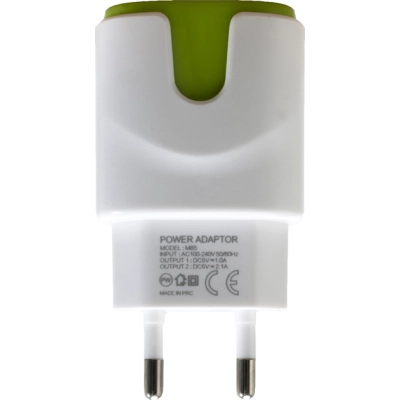 Пристрій зарядний мережевий 2xUSB 2.0 2A/1A, біло-зелений Patron (PN-2USB-220V-G) опис