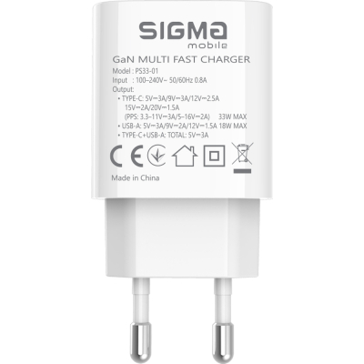 Зарядний пристрій Sigma 1xUSB-C PD33W + 1xUSB QC3.0 GaN X-power PS33-01 white (4827798527719)