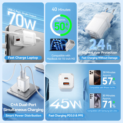 Тип - адаптер, Живлення - мережа, Призначення - для планшета, для фітнес-браслета, для рацій, для геймпада, для екшн-камер, для смарт годинника, для TWS навушників, для телефону, тип вихідного підключення - USB Type-C, USB, Max - 3.5 А, 70 Вт, кількість USB портів - 1 x USB, 1 x USB Type C, швидка зарядка - Fast Charging, сірий