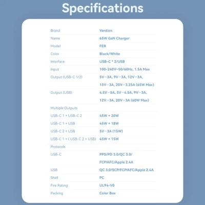 Тип - адаптер, Живлення - мережа, Призначення - для планшета, для фітнес-браслета, для рацій, для геймпада, для екшн-камер, для смарт годинника, для ноутбука, для TWS навушників, для телефону, тип вихідного підключення - USB Type-C, USB, Max - 5 A, 65 Вт, кількість USB портів - 1 x USB, 2 x USB Type C, швидка зарядка - Quick Charge, Power Delivery, Programmable PowerSupply (PPS), білий